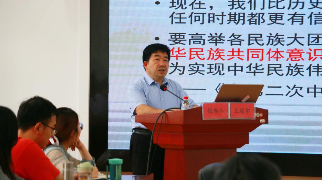 王延中研究员是中国社会科学院民族学与人类学所所长、中国民族学学会会长、中国社会科学院大学教授、博士生导师,中央统战部、国家民委等部委的决策咨询委员,国家“万人计划”哲学社会科学领军人才。王教授的讲座主要从铸牢中华民族共同体意识重大论断的提出与意义、当前民族领域若干理论认识的分歧、加强新时代民族理论研究的几点思考三个方面展开,系统梳理了习近平总书记提出铸牢中华民族共同体意识这一原创性重大论断的历史过程,阐明了铸牢中华民族共同体意识的伟大意义,介绍了铸牢中华民族共同体意识成为民族工作主线之后对民族学研究、民族工作开展提出的新要求,以及新时代民族理论的热点和方向。