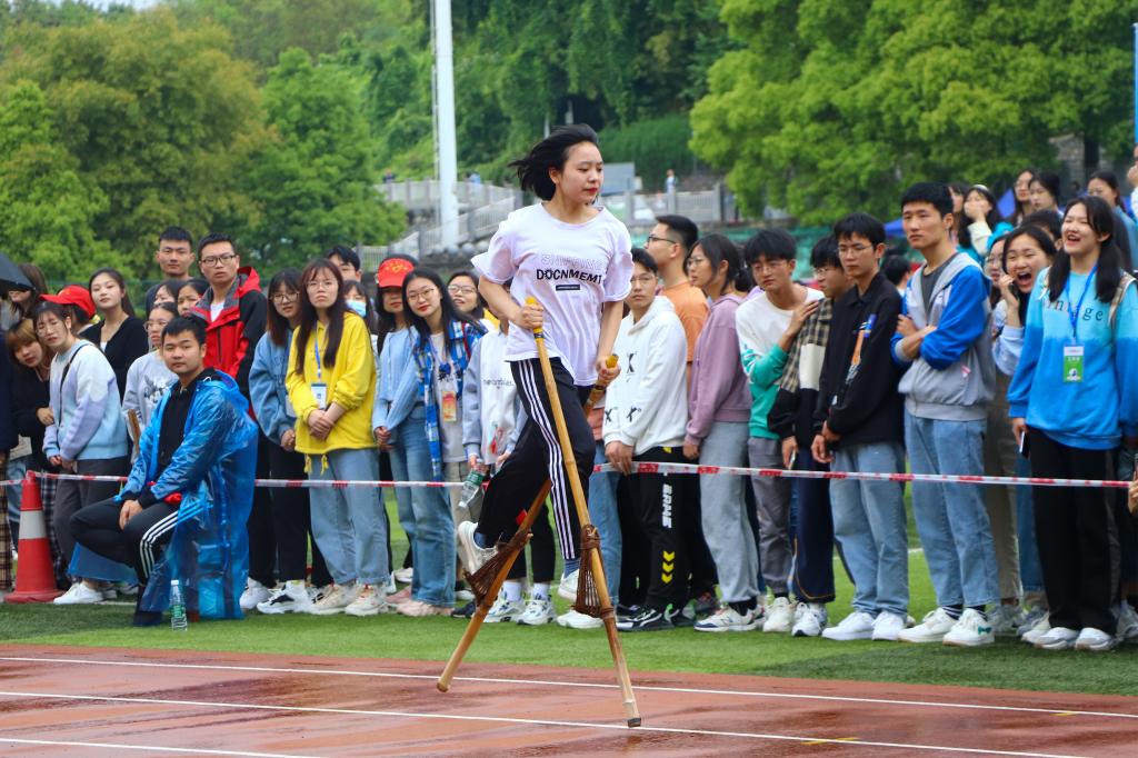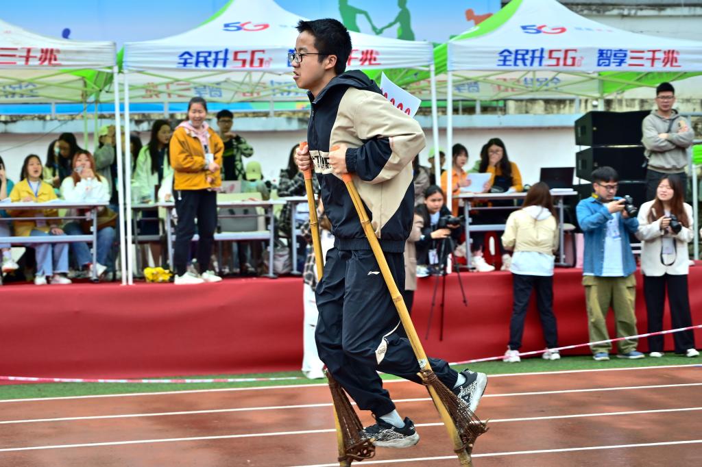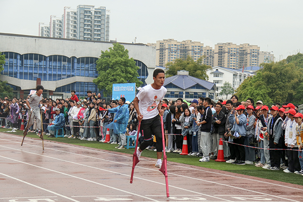 一声令下,脚踩高跷,不畏风雨险阻,争分夺秒冲破红线。