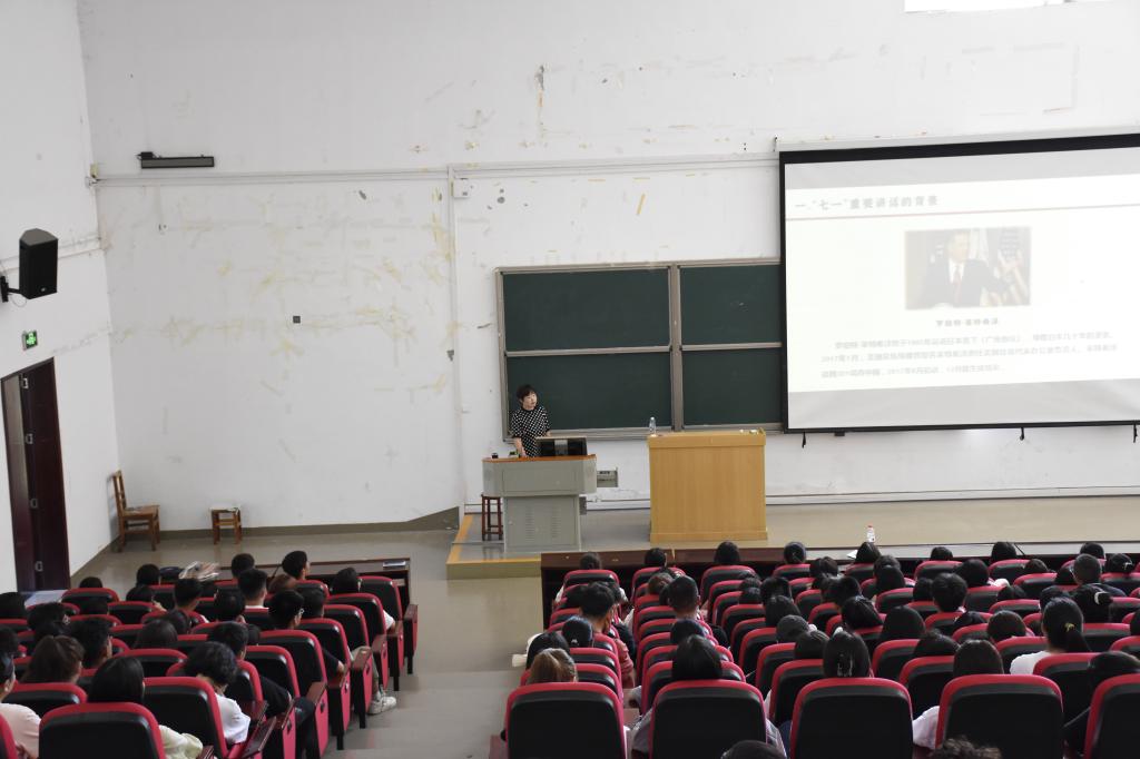 本网讯(记者 刘颖)这是一堂精彩的思政课,是一节鲜活的党史课,是一次生动的辅导报告,也是一场特别的开学第一课。9月9日下午,学校党委宣传部和学生工作处联合组织的“学习贯彻习近平总书记‘七一’重要讲话精神宣讲报告会”2021级新生专场在学校修远楼5A207举行。恩施州党史学习教育宣讲团成员、学校马克思主义学院副教授周传和为300多名新生代表作了专题辅导报告。