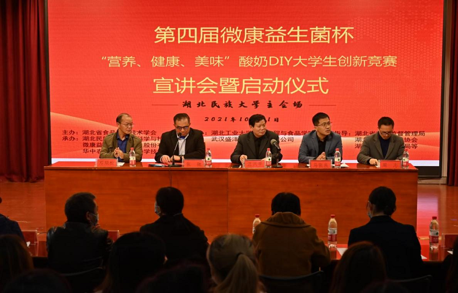 会议分启动仪式、知识科普及赛事宣讲两个阶段。湖北省教育厅、湖北省卫生健康委员会、湖北省市场监督管理局、湖北省科学技术协会等单位负责人在线出席本次启动仪式;微康益生菌(苏州)股份有限公司董事长助理、总经办主任马张良应邀在主会场出席仪式;湖北省食品科学技术学会、环境食品学教育部重点实验室、微康生物科技有限公司研究院等领导和企业代表及华中农业大学食品科学技术学院师生代表应邀在华农分会场参加会议。