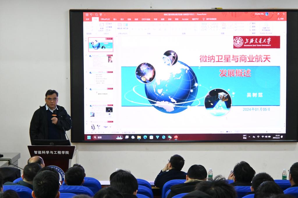 1月5日,国际宇航科学院院士、上海交通大学航空航天学院讲席教授、博士生导师吴树范应邀来校开展以“微 纳卫星与商业航天发展概述”为主题的学术报告。学校党委常委、副校长李军主持报告会,学校100余名师生聆听了报告。