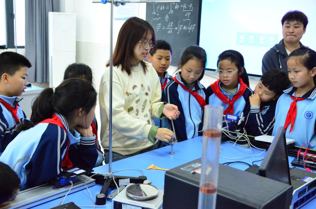 随后,每个小组成员在老师的引领下自行实验。现场氛围欢快与热烈。志愿者带领同学们通过物理器材体验了物理运动的各种情况,以及记忆金属等各种新材料。