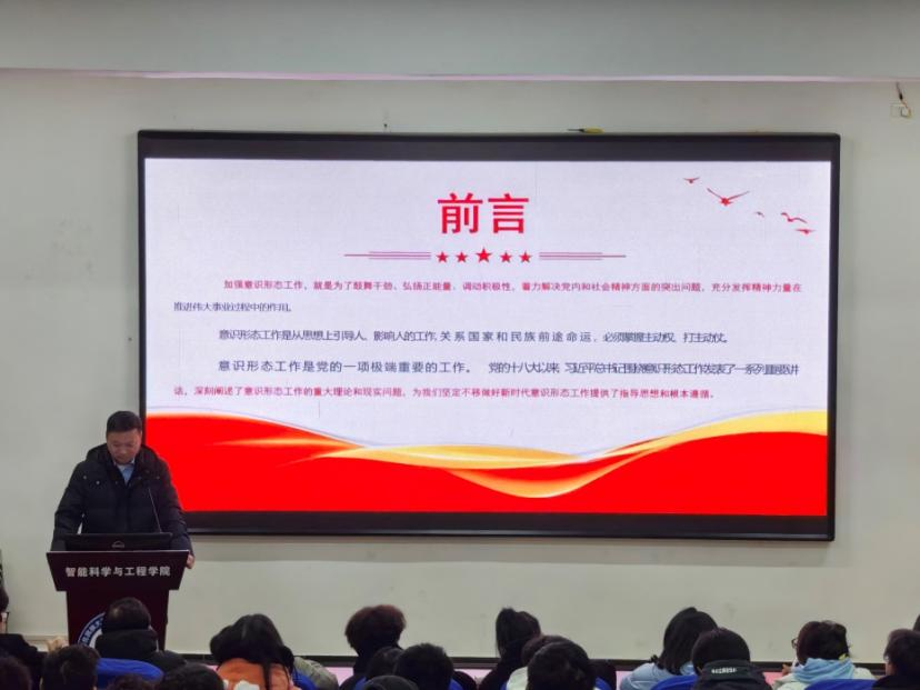 12月15日20:20,在集成楼213教室,我院院长陈世强为青马班学员带来了一场主题为“坚定不移做好新时代意识形态工作”的精彩授课。此次培训班吸引了我院学生会、团总支成员,以及各班团干部踊跃参与,现场学习氛围浓厚。