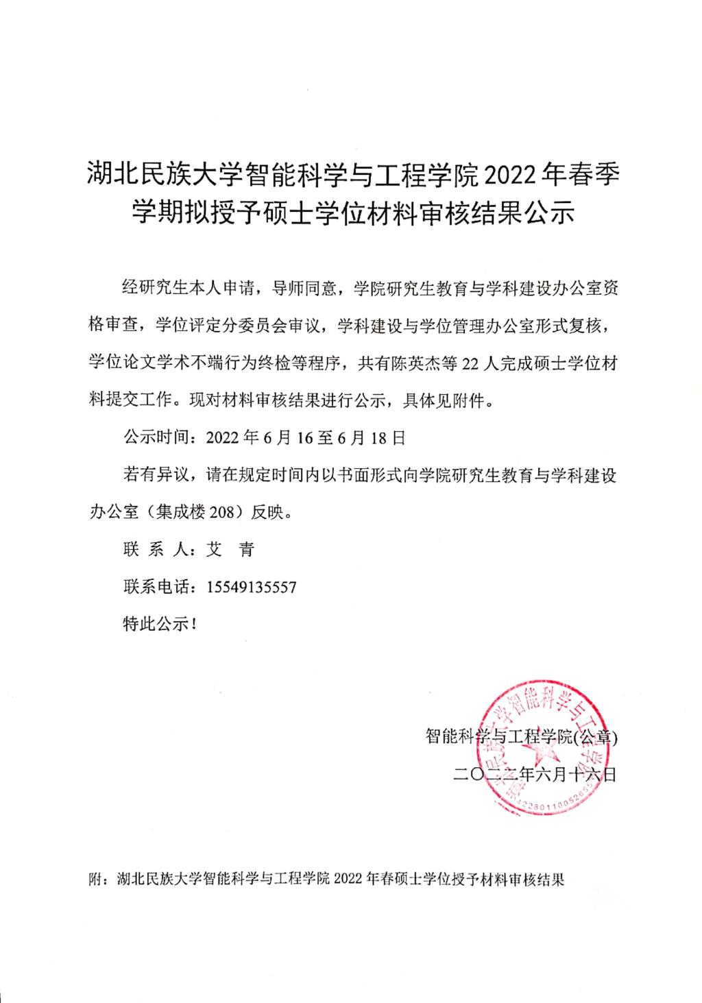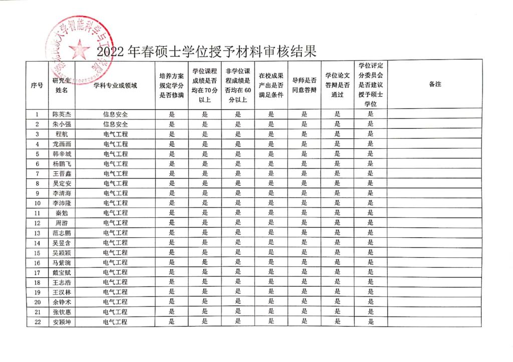 智能科学与工程学院2022年春季学期拟授予硕士学位材料审核结果公示