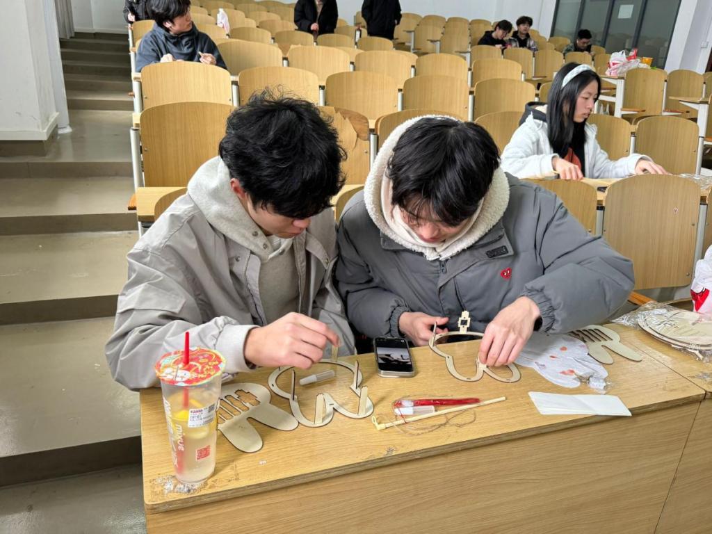 与之相邻的是做灯笼的场地,素雅的纸、纤细的竹条在同学们手中变成了一盏盏精巧的灯笼。大家相互仔细学习,细细揣摩。当灯笼被点亮,柔和的光芒散发出来,寓意着希望与团圆,也照亮了同学们对传统文化的热爱之心。