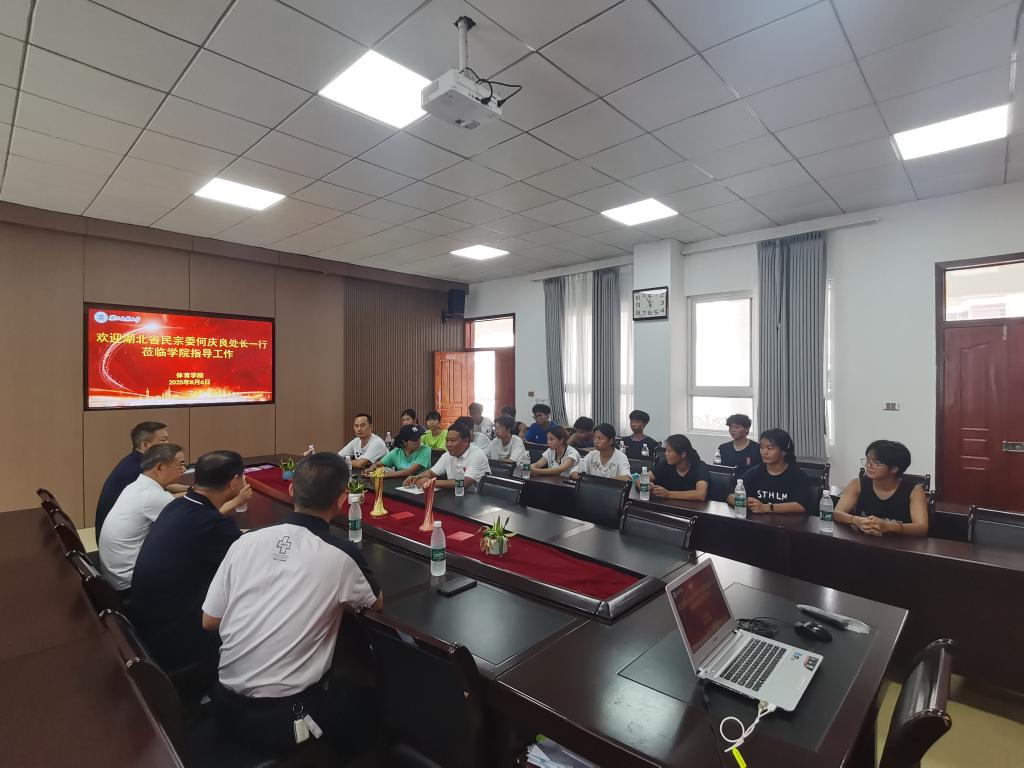 8月6日,湖北省民族宗教事务委员会何庆良处长、郭用德一级调研员一行莅临36365线路检测登录入口体育学院,就高脚竞速训练基地建设工作进行调研指导,并慰问暑期集训运动员。学校党委常委、副校长李军,体育学院院长何斌、副院长胡庆华及基地教练员孙传清、陈芬、周一系陪同调研。
