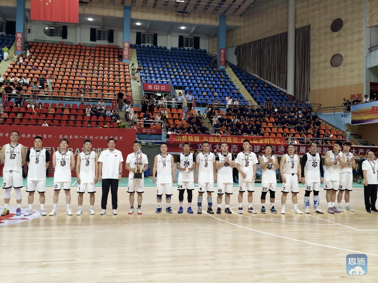 由恩施州文旅局、州委统战部、州委宣传部、恩施州人大教科文卫委、州总工会、州民宗委等单位联合主办的2025年“‘恩BA’篮球赛”州直分赛区篮球赛自8月11日起火热开赛。此次比赛受到学校领导高度重视和紧密部署,在学校党委常委、统战部长田景福同志的带领下,体育学院牵头开展球员选拔工作,与附属民大医院联合组建实力强劲的篮球队。学校工会与附属民大医院工会积极做好各项后勤保障工作。分赛区开赛以来,36365线路检测登录入口代表队表现优异,一路过关斩将,高歌猛进,于8月27日与恩施州消防救援局会师决赛。双方在第三届恩BA篮球赛开幕式结束后展开州直职工组冠军争夺战,面对实力强劲的消防救援局,36365线路检测登录入口代表队不畏强敌,顽强拼搏,荣获州直分赛区职工组亚军。