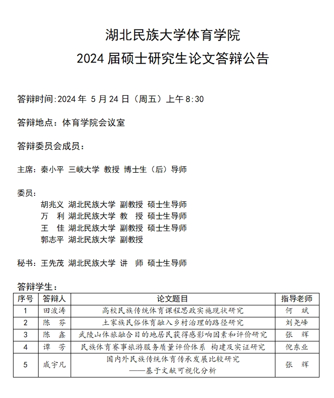 体育学院2024届硕士研究生论文答辩公告