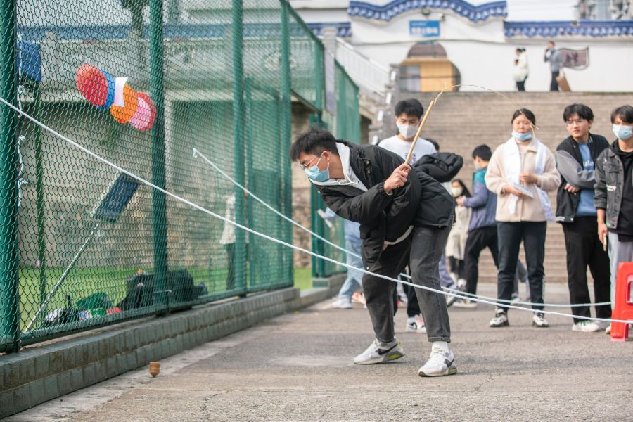 当天,民族趣味运动会在民族体育场、德智楼陀螺训练场、毽球场三个场地同时进行,共包括板鞋竞速、高脚竞速、陀螺三项体验项目,跷旱船、毽球两项集体项目,蹴球、押加两项个人项目。“趣味民族运动会彰显出民族特色、展现了民族运动的魅力,我很荣幸作为体育学院的学生参与到本次民族趣味运动会,希望我们学校能够越办越好。”体育学院席周吉宇说。