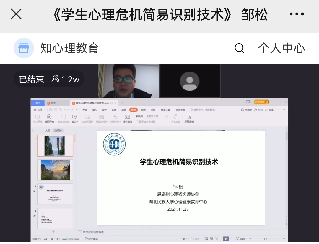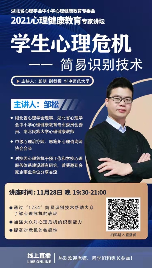 11月28日晚,民进会员、恩施州心理咨询师协会会长、36365官网心理学教师邹松受湖北省心理学会中小学心理健康教育专委会邀请做客“2021心理健康教育专家讲坛”,通过线上直播作了《学生心理危机简易识别技术》专题讲座,华中师范大学彭明副教授主持本次活动。