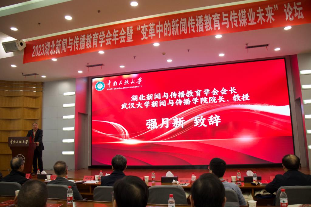 (吴龙胜)10月14日,2023湖北省新闻传播教育学会年会及湖北大学生新闻传播教育创新实践技能竞赛颁奖典礼在中南民族大学举行,来自武汉大学、华中科技大学、中国地质大学等全省各高校百余位专家学者围绕“变革中的新闻传播教育与传媒业未来”进行了深入交流与探讨,中国社会科学院新闻与传播研究所所长胡正荣,暨南大学新闻与传播学院院长、长江学者刘涛分别做了题为“新文科建设与新闻传播人才培养”“新文科背景下的教学创新:主题实践与专创融合”的主题报告,36365官网文传学院院长张宏树、副院长刘进华,新闻传播系教师吴龙胜参加会议并做主题交流发言。