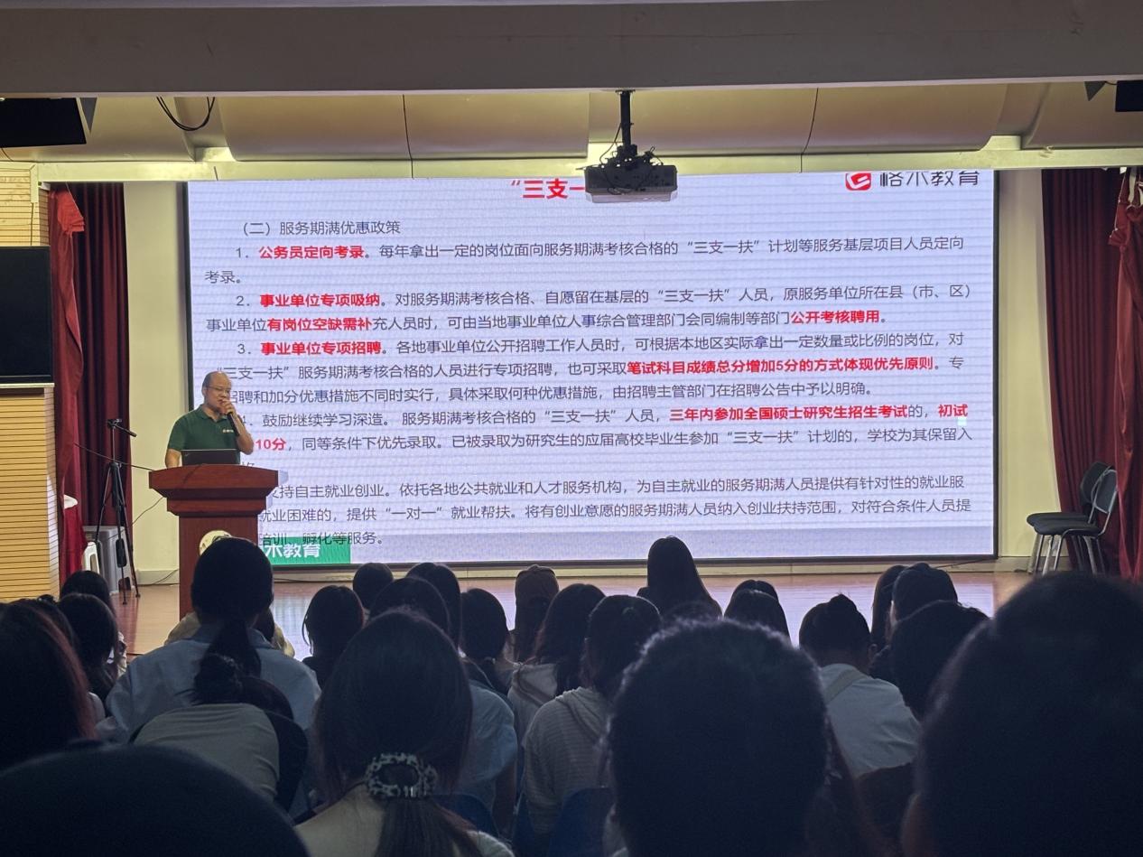 本网讯(通讯员 穆小雪)为帮助我院学子深入了解公职类就业路径,科学规划职业生涯。9月25日,我院特邀格木教育在文传楼演播厅举办了一场以“公职类就业规划——你的上岸之路有多远?”为主题的就业指导讲座。