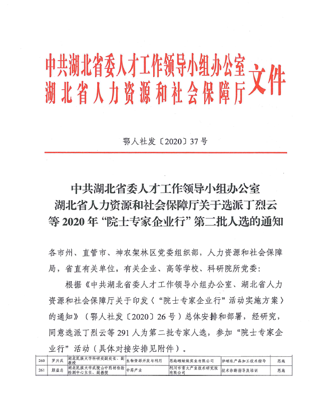 颜益志入选2020年湖北省“院士专家企业行”活动名录