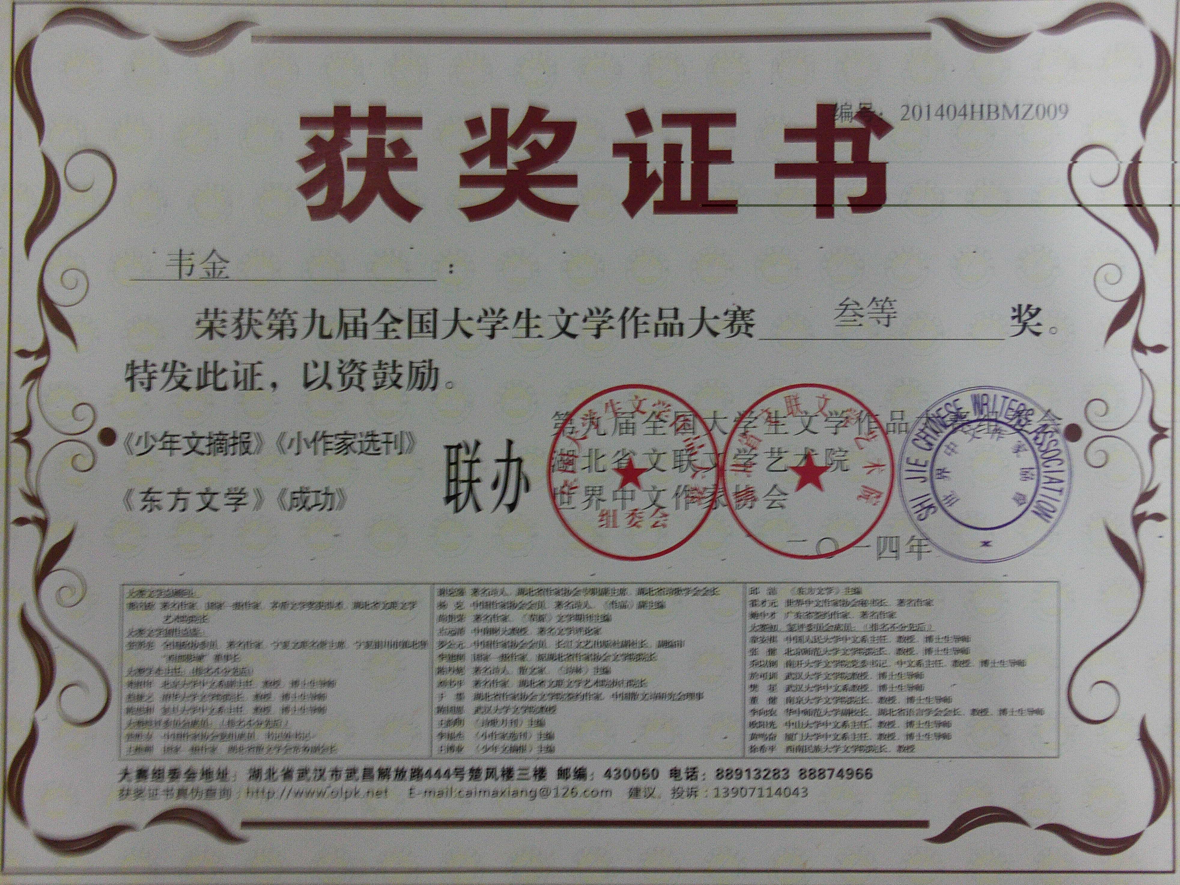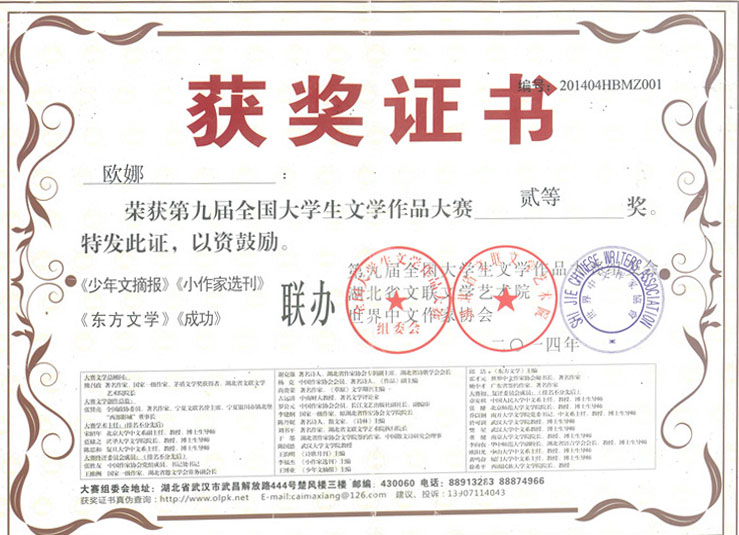 文学与传媒学院学生在第九届全国大学生文学作品大赛中获奖