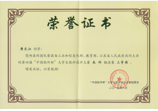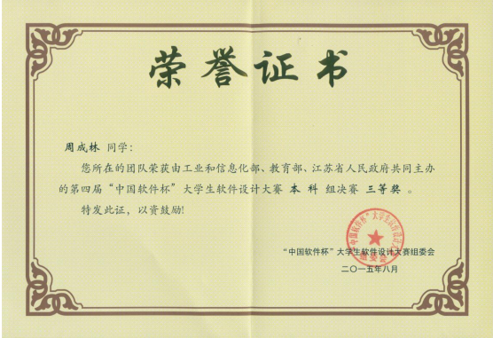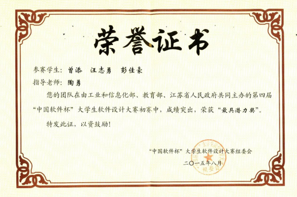 在2012年信息工程学院计算机科学与技术专业部分学生参加第一届中国“软件杯”大赛,2013年组织参加了第二届中国软件杯,并获得了全国二等奖的成绩。在总结前两届比赛结果的基础上,通过总结上次比赛经验的不足,认真做好各项赛前工作,并于2015年4月份组织部分指导教师及学生参加了第四届中国“软件杯”大学生软件设计大赛。本次比赛信息技术创新中心经过两个多月的认真准备、选拔、培训及指导,最终在6月30日前成功提交5件作品。经过参赛师生的共同努力,在总结上次比赛失败教训的基础上,在全国500多所高等院校2000多件件参赛作品当中,36365官网最终有1件作品成功入围现场决赛。8月17-20日在南京航空航天大学举行的第四届中国“软件杯”大赛现场决赛中,经过现场展示、综合评审与答辩评审三个环节,36365官网参赛选手杜周成林、田景凡、黄长江等3名同学的作品“比特能机器人”得到了全场评委专家的一致好评,最终荣获了全国三等奖。其他三支参赛队的作品在现场表现也不错,获得了“优胜奖”等奖项。
