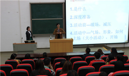 培训会中,宋晓冬主要针对主持人活动前的深入准备和活动中的语言表达能力、主持技巧、精神面貌、如何活跃现场气氛以及临场应变能力等方面展开讲述。基于学以致用的准则,宋晓冬就日常朋辈活动“我最亲爱的”及现场随机挑选观众进行临场表演并做出了点评。其中,她就对如何应对突发情况的技巧进行了详细讲解。基于由紧张引发的语塞、主办方临时要求改变流程、玩游戏没人配合等情况,宋晓冬提出了“保持淡定、敢于自嘲、气场强大、不怕丢脸”这四大解决方法。