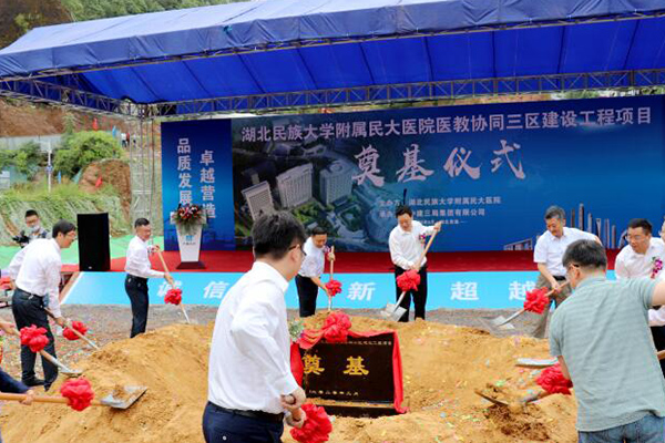 奠基仪式上,民大医院院长刘伦志对到场领导、嘉宾表示感谢,并简要介绍了该院三区项目情况,表示医院会将三区项目打造成一个阳光工程、示范工程,为全州乃至武陵山地区人民群众健康事业保驾护航,为“健康恩施”做出民大医院应有的贡献。中建三局工程总承包公司、监理单位代表作表态发言。