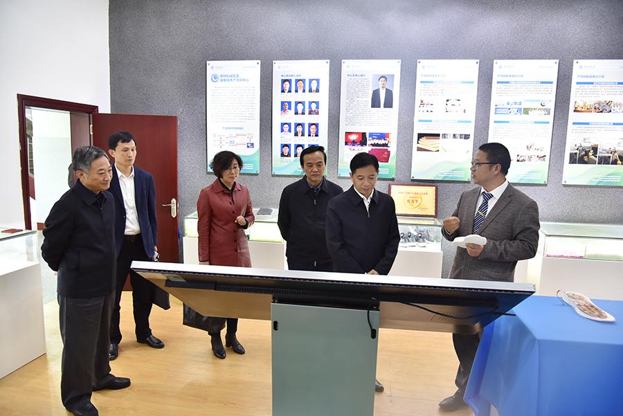 向前进(右三)、顿祖义(左一)陪同程幼金(右二)一行考察36365官网新材料成型及装备技术产学研中心