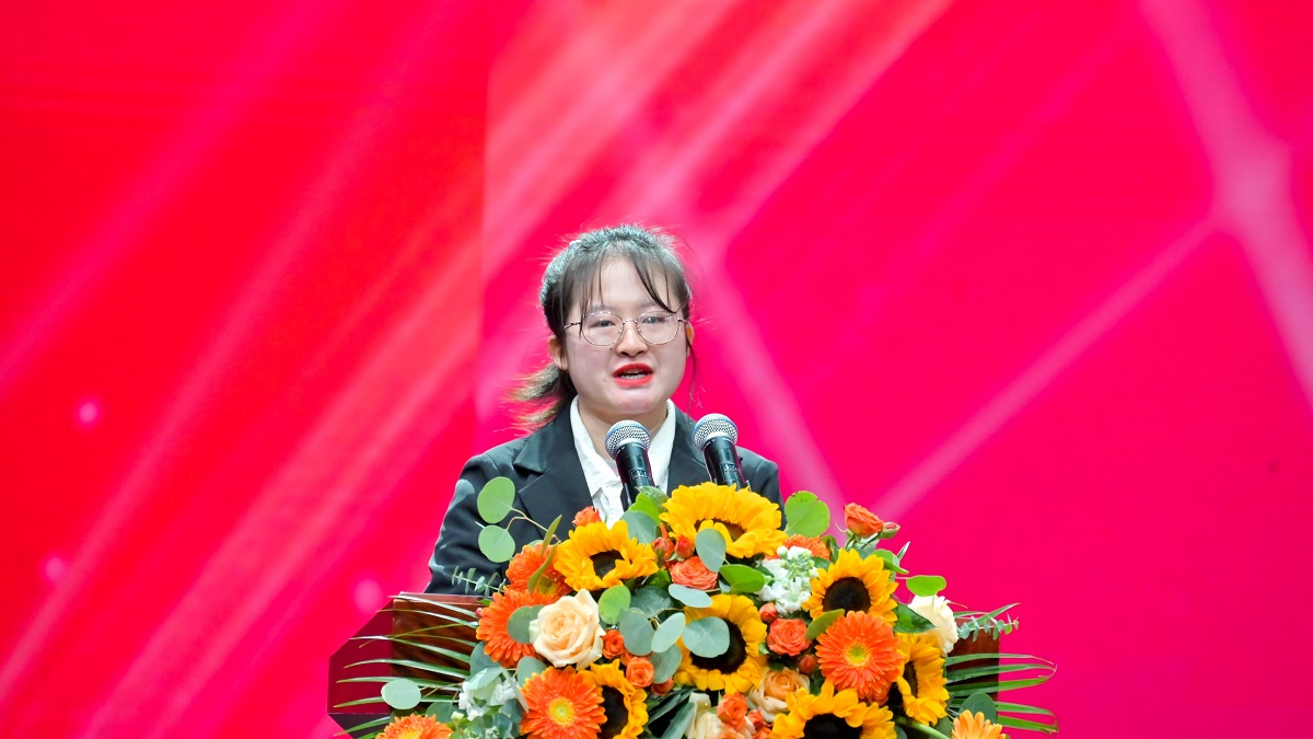 参赛代表覃梦圆发言。她认为,好的美食产品要兼具口味风味、包装、受众群体等多个方面,将学科知识与烹饪技术结合,将绿色健康且无添加的理念深入人心。