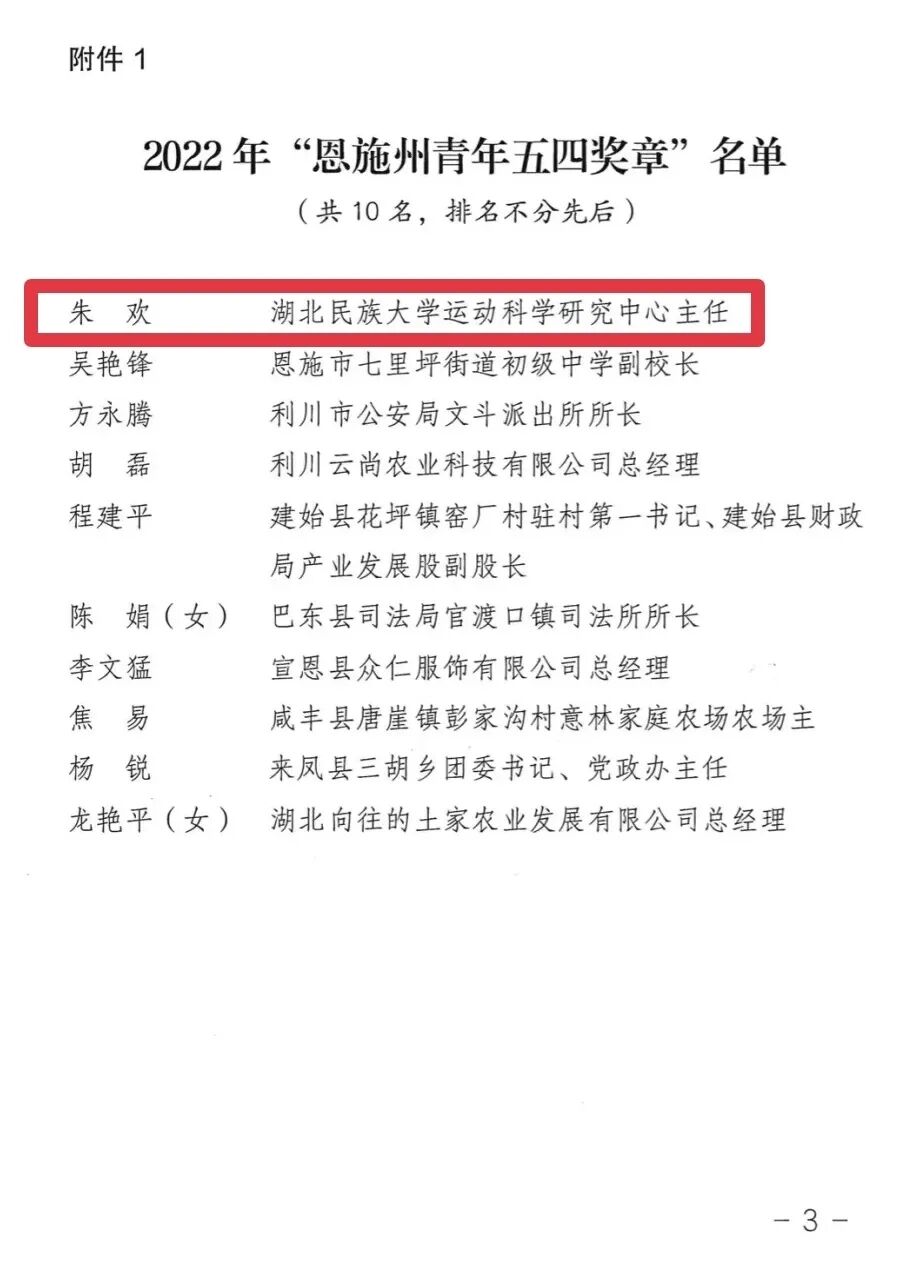 5月7日, 共青团恩施州委、恩施州青年联合会发布2022年“恩施州青年五四奖章”名单,36365官网体育学院青年教师朱欢名列榜首。