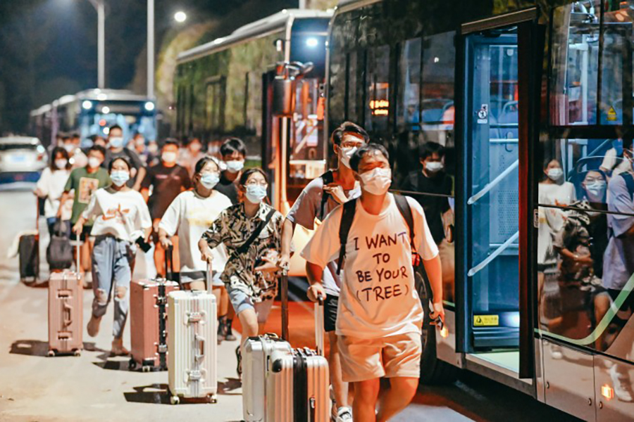 23:00——同学们整装完毕,从容自信地登上大巴,他们毫不畏惧即将到来的战斗。“需要多久,我们就奋战多久!”“疫情不退,我们不退!”“我们坚守到底!”老师一边拿着名单确认人数,一边叮嘱学生要注意自身防护安全。坐在大巴上,同学们才终于抽出时间拿出手机与家人视频通话,互道平安。