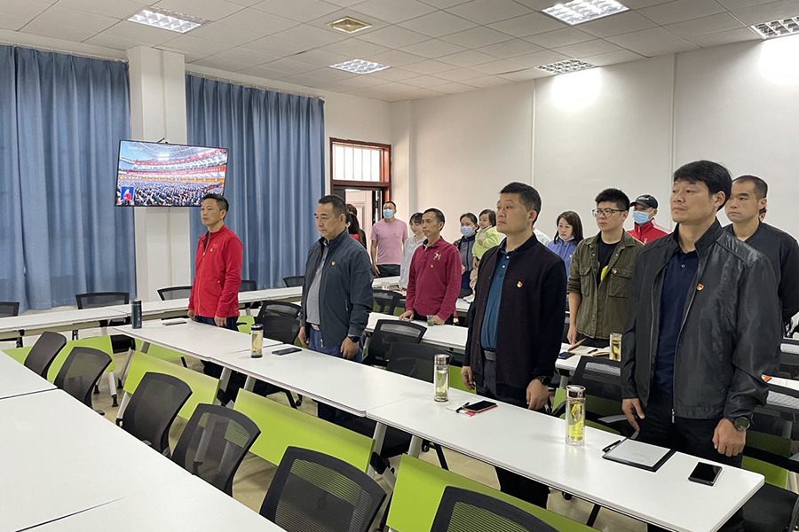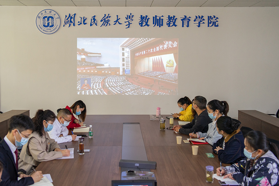 教师教育学院教师党员干部在学院会议室集中观看党的二十大开幕会。(袁广来 摄)