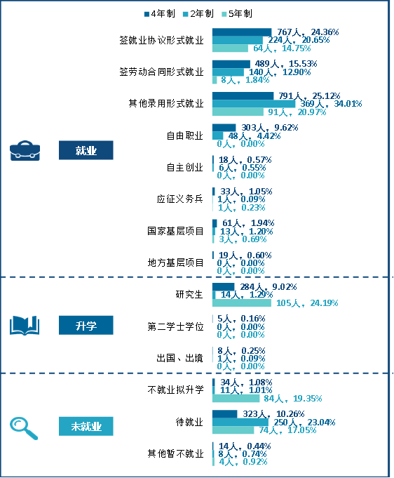 36365官网2022届本科毕业生中,4年制毕业生“签就业协议形式就业”(24.36%)的比例较高,2年制毕业生“其他录用形式就业”(34.01%)的比例较高,5年制毕业生读“研究生”的比例(24.19%)较高。