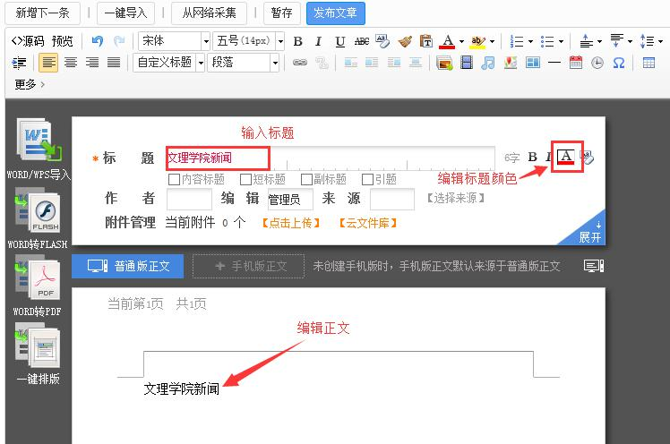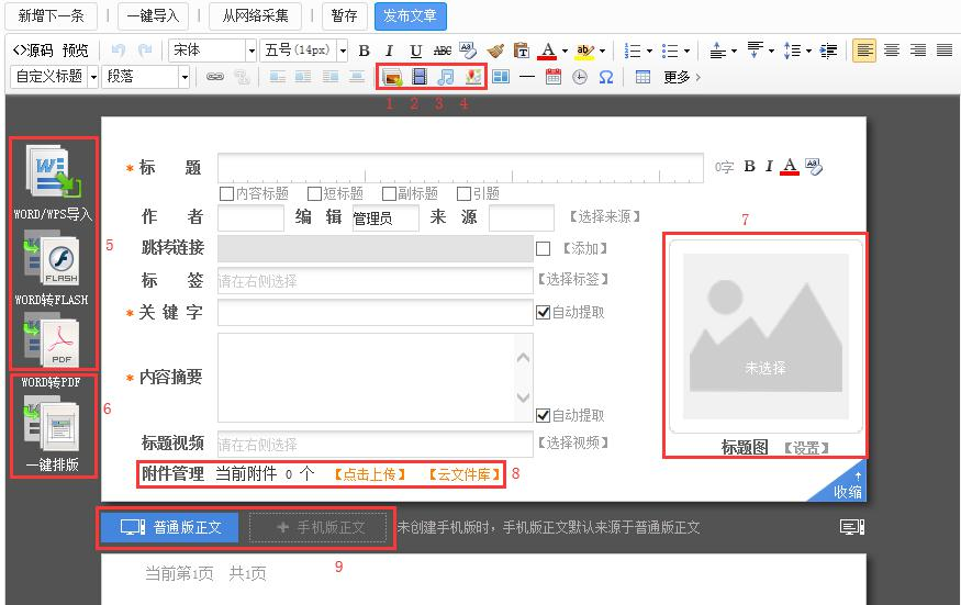 5、发布文章已存在 word 文档时,添加文章时点击图中 5 位置可直接一键导入 word 文档;若想将 word、wps、ppt、excel、PDF 格式文档转换成 flash 格式上传,添加文章时点击图中 5 位置按钮进行添加;若想将 word、wps、ppt、excel 格式文档转换成 PDF 格式上传,添加文章时点击图中 5 位置按钮进行添加;