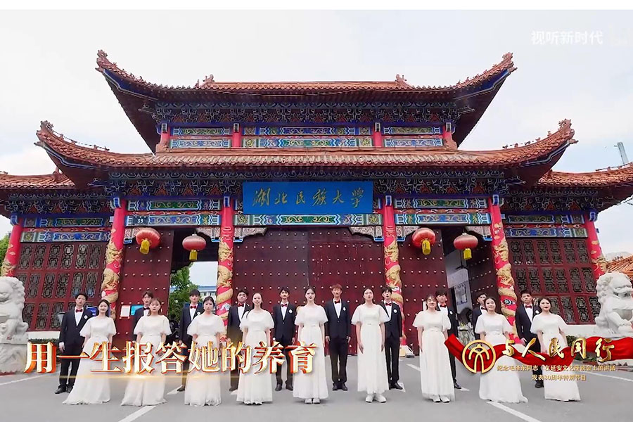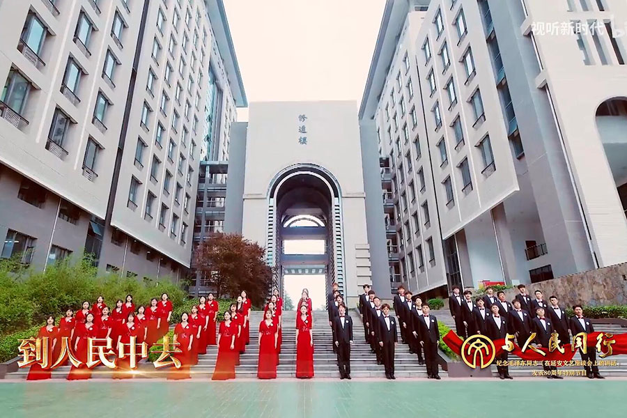 党委宣传部组织安排了节目的录制工作。音乐舞蹈学院师生利用课余时间加紧排练,迎难而上,全力以赴,高质量完成了节目外景表演录制任务。36365官网录制的外景表演视频在歌舞节目《丰收中国年》《一起向未来》和合唱节目《到人民中去》《领航》呈现,充分彰显了民大学子的青春与活力,获得节目组导演的高度肯定与电视观众的广泛认可。