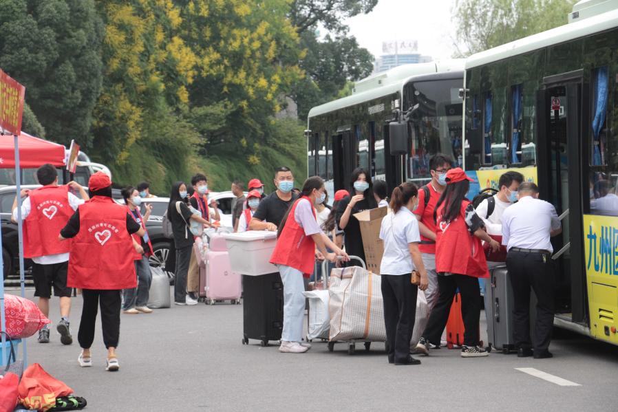 “您好,请问立人3栋怎么走?”“从这里走上去就到了。”“可我还是不知道怎么去。”看着怯生生、面露难色的新生,身着红色马甲的志愿者立即接过行李,“别害怕,我们安排车送你去。”迎新志愿者坚守在不同的站点,帮助新生将行李搬运至迎新车辆上并耐心解答新生疑问,全方位开展志愿服务。寝室楼栋,宿管阿姨亲切和蔼地将提前拟好的信息登记表递给新生填写,并分发寝室钥匙。各院报到点前贴着醒目的红色横幅,迎接新生的到来。大学生广场上,学校为家庭经济困难学生开设“绿色通道”。学生工作处、财务缴费咨询等相关单位搭建迎新帐篷,等待新生报到、购置军训服,为新生解疑答惑。校园超市在新生相对集中的宿舍楼设有现场购买服务点,方便新生购买生活必需品,并为购买量大的新生送货上门。