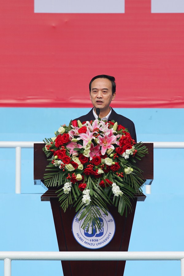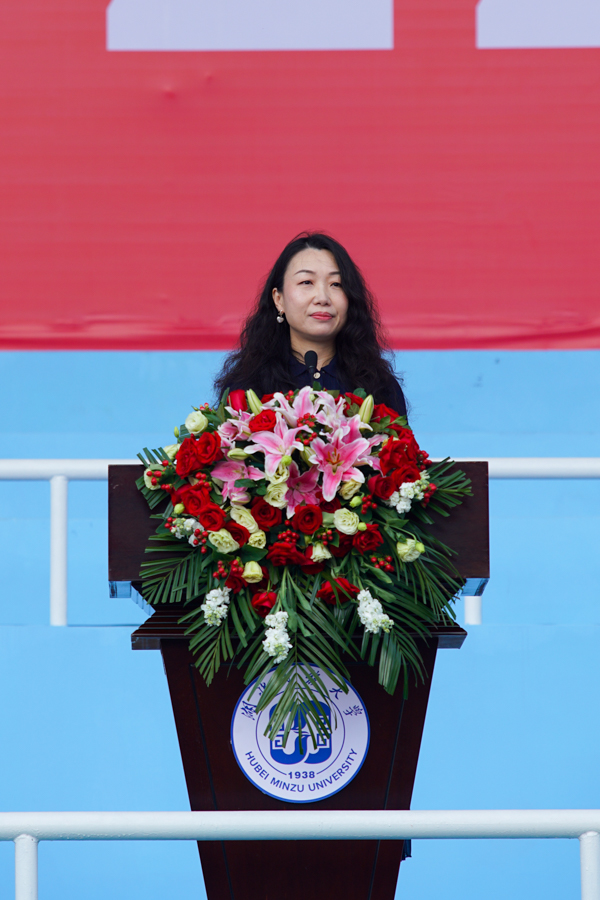 美术与设计学院副院长、文学博士、硕士研究生导师李嘉教授代表全校教师发言。她祝愿同学们秉承“博学博爱、立人达人”的校训,继承“艰苦奋斗、甘于奉献、自强不息、追求卓越”的民大精神,在林木丰茂的校园里立远志、获学识、长阅历、增才干、强本领、塑品格。