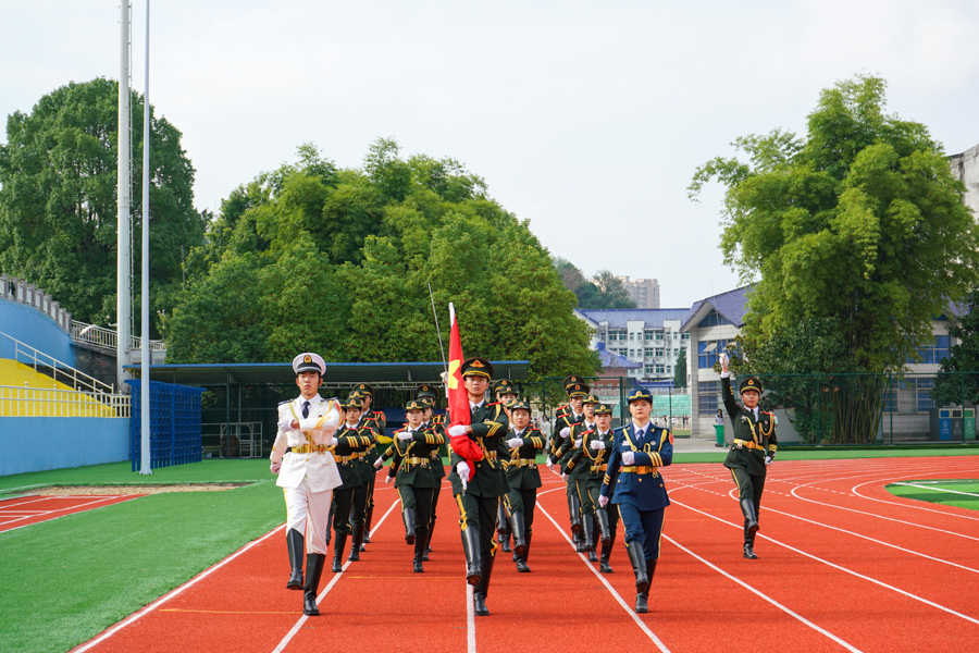 开学典礼在庄严的国歌声中拉开帷幕。全体师生目视五星红旗冉冉升起,在蓝天白云的背景下高高飘扬。