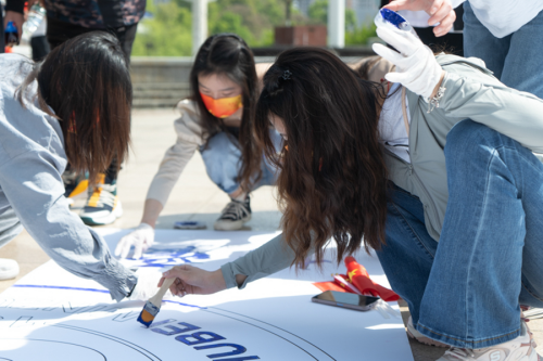 活动分为“献礼建团一百周年彩色绘图”和“鸡毛送信”两个环节。第一个环节包括“献礼百年”和“民大校徽校训”两部分。参与者参照样板,手持小颜料盒,在以白色线条图为底板的图幅上绘制上色。待所有图幅绘制完毕,参与者将图放置在场地中央拼接,面向图幅进行集体宣誓并齐唱团歌。
