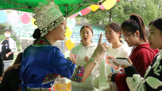 其歌舞展示区是另一番热闹景象,《黄四姐》、《龙船调》、《六口茶》等耳熟能详的土家族山歌响彻活动现场,更有同学现场展示土家“摆手舞”以及传统技艺“打连响”,赢得现场同学的阵阵掌声。