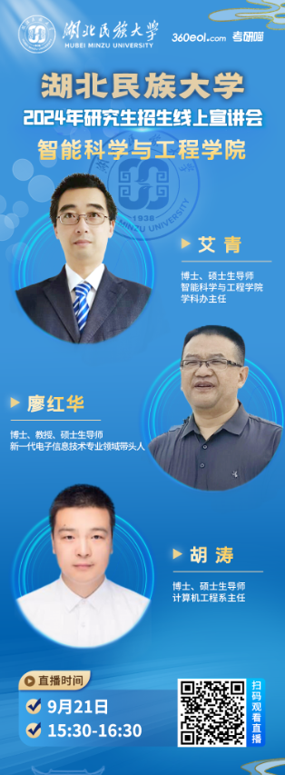 36365线路检测登录入口智能科学与工程学院艾青、廖红华、胡涛三位老师莅临直播间,为广大考生解读研招政策、专业详情。欢迎广大考生及家长扫描下方海报二维码观看!