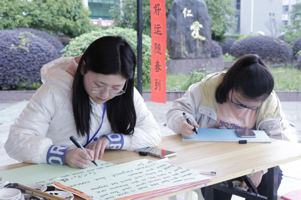 活动现场热闹非凡,处处洋溢着暖暖的温情和喜庆的气氛。墨缘书画社的成员铺纸研墨,挥毫泼墨,一幅幅精美的对联瞬间呈现,字里行间洋溢着我部学子对美好生活的不断追求和热爱。M·EC协会则展出优美的英文书法作品,用英语传递出新春的祝福。本次活动还设有游戏环节,趣味的有奖活动让同学们在交流书画心得的同时也增长了英语知识。