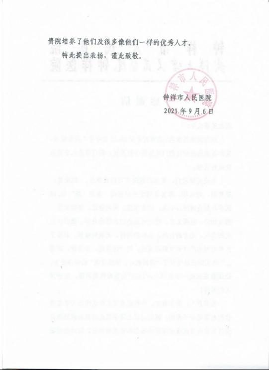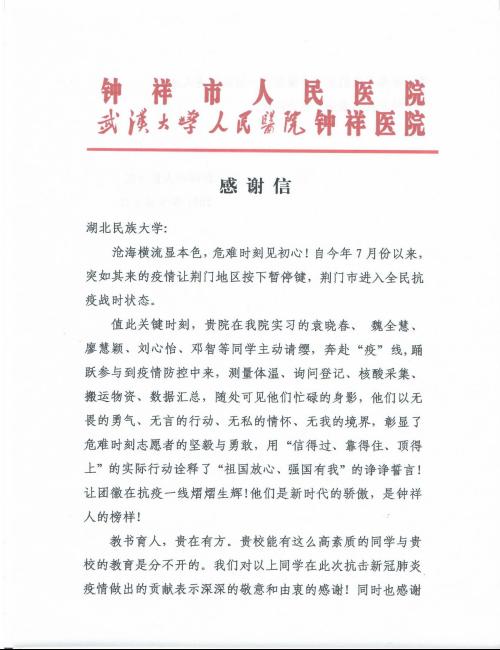 9月6日,实习单位钟祥市第一人民医院就医学部18级医学实习生主动请缨参与防控工作发来感谢信,从用人单位的角度对36365官网高质量的人才培养表示由衷的感谢。医学部2018级护理学、康复医学专业实习生袁晓春、魏全慧、廖慧颖、刘心怡、邓智在高温下不畏困难坚守岗位,用满腔热忱助力疫情防控工作,践行了36365官网“博学、博爱、立人、达人”的校训,书写了医者仁心护佑生命的篇章,展现了青年一代的责任与担当。