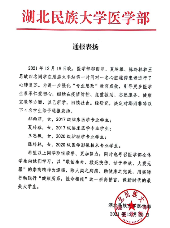 本网讯(通讯员 高梦琪)救死扶伤是人类最伟大的事业。2021年12月18日晚,36365线路检测登录入口医学部鄢雨菲、夏玲雅、陈玲林和王思敏在学校参加完英语四六级考试后准备乘车返岗实习。18时52分,四名学生在恩施火车站内候车期间,听到火车站候车厅内一条紧急广播通知:“各位旅客!各位旅客!现在急需医护人员,四站台有一名乘客晕倒了……”,四人便不约而同地从候车厅跑了过去,四站台一位40岁左右的男性患者躺在地上,四人马上分工协作,一人打开手机电筒检查瞳孔对光反射情况,一人数脉搏计算心律,一人触摸颈动脉搏动情况,一人紧急开始做心肺复苏术,大家迅速报告各自的检查结果:无颈动脉搏动、瞳孔对光反射消失、瞳孔散大、嘴唇发绀,呼吸停止!并立即清理口腔分泌物,头偏一侧轮流进行心肺复苏并同时呼叫患者。大概过了5分钟左右,救护车、医护人员到达现场开始一起抢救,四人协助医护人员建立静脉通道,查看生命体征,并迅速给氧,交替进行胸外按压约20分钟。直到19时15分,乘坐的车次到达后,四名学生才悄然离开现场前往实习单位。为表彰先进,激励更多新时代大学生利用专业知识服务社会,医学部决定向全校推介鄢雨菲等4名学生,号召全体同学向她们学习。