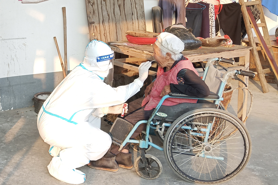 志愿者走到坐轮椅的老人面前,为他们进行核酸采样