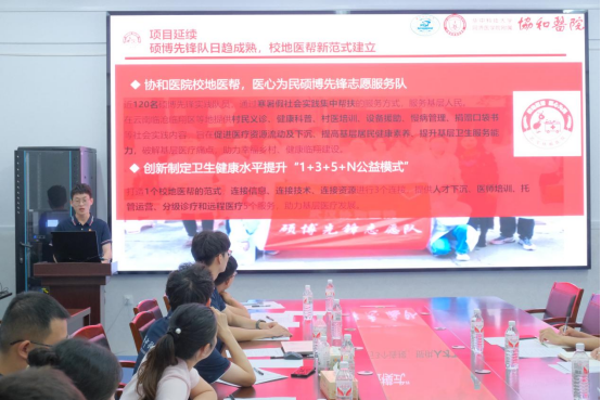 随后,硕博先锋志愿服务队队长何嘉泰以《党旗领航 喻见利川 校地医帮 医心为民》为主题进行报告,从“架结构搭团队——团队简介、校地情共帮扶——活动开展、话成果成理论——活动经验、聚课题再实践——活动展望”四个篇章详细介绍了协和医院硕博先锋队建设情况和所获得的成果。