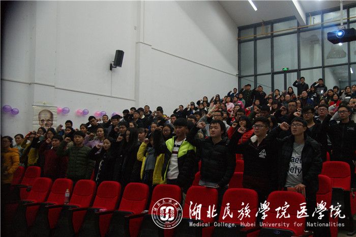 比赛接近尾声时,主持人播放了一组关于临床医生们日常工作的PPT:《穿“长筒袜的医生”》等,使同学们体会到医生的不易。PPT播放完毕,主持人带领场上二百多名医学生宣读医学生誓言,这也是本次人体解剖标本解说大赛与往届最大的不同之处。