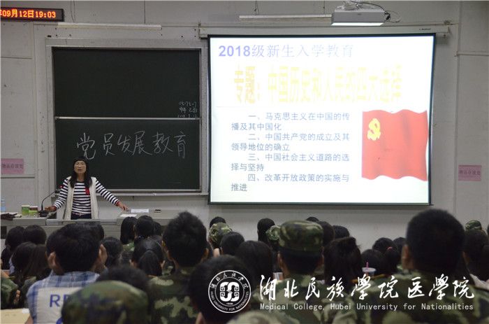本网讯(记者 向锦月 刘峻银/文 吕丰旭/摄)9月12日,我院团总支组织纪检部开展的2018级新生入学教育系列讲座于医学院8103、8206、8304教室顺利进行。本次讲座由我院学生科老师郑娅、冷红豆、艾尔肯•吾斯曼担任主讲人,我院2018级全体新生聆听讲座。