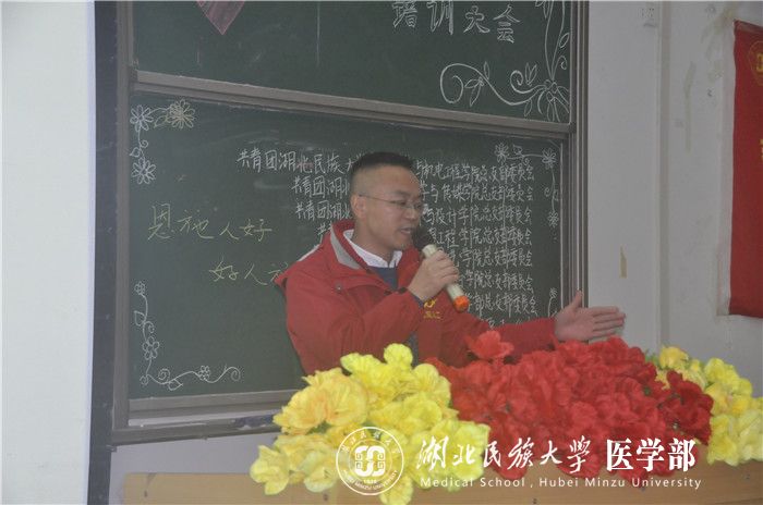 本网讯(记者 周玉珠 郭恩惠/文 崔玉娇/摄)11月22日晚,由医学部、文学与传媒学院、信息工程学院、美术与设计学院、音乐舞蹈学院、林学园艺学院以及新材料与机电工程学院等七院联合举办的“聚青春之力,树志愿风采”志愿者培训大会在修远楼5B404教室圆满落幕。恩施义工协会严书田、邓帮华、王余丽、冯润平,医学部学生工作办公室老师梁丹玉、袁琳,林学园艺学院团总支书记刘桃元应邀出席,校团委相关部门负责人及七院一百余名青年志愿者参加培训。此次培训由恩施义工协会严书田老师担任主讲人。