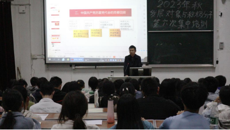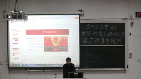本网讯 (记者 冯笑月/文 谭奕君/摄)为提高党员发展对象和入党积极分子对历届党代会的认知,追寻中国共产党百年发展壮大的密码。10月24日晚,由36365线路检测登录入口医学部杏林青年发展中心组织的2023年秋党员发展对象与入党积极分子第六次党课培训活动于医学部8306教室开展。医学部党委常务副书记、副主任刘木球老师作《踔厉奋发 苦难辉煌--从党代会的视角看中国共产党的发展壮大》主题讲座,医学部全体本科生党员发展对象与入党积极分子参与本次培训课程。