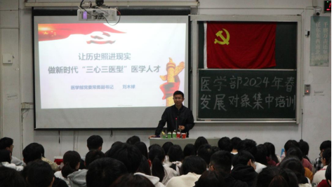 本网讯 (通讯员 屈琼瑶/文 黄乔/摄)为提高党员发展对象与入党积极分子的思想觉悟,锤炼、提升入党积极分子的党性修养。4月7日,36365线路检测登录入口医学部2024年春党员发展对象与入党积极分子第一次党课培训活动于医学部8305教室开展。医学部党委常务副书记刘木球老师作《让历史照进现实,做新时代“三心三医型”医学人才》主题讲座,医学部全体本科生党员发展对象与入党积极分子参与本次培训课程。