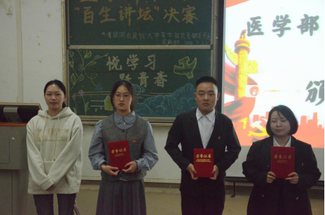 本网讯 (通讯员 蔺浩/文 李江洁 唐红旺/摄)为激励学生更好地肩负新时代赋予的光荣使命,持续深化学习习近平新时代中国特色社会主义思想。4月27日,由医学部团总支宣传部主办的第八届“百生讲坛”决赛于修远楼5B508教室顺利举行,医学部团总支书记钟迪颖老师,团总支副书记赵政清同学、郑若童同学、李运坤同学担任本次比赛的评委。