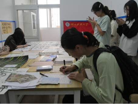 另一边,明信片书写互动环节热闹非凡。同学们在明信片上书写书中话语,或表达感悟,或抒发憧憬。活动不仅展示了艺术之美,还激发了同学们的创造力与表达能力,推动了传统文化的传承与发展。