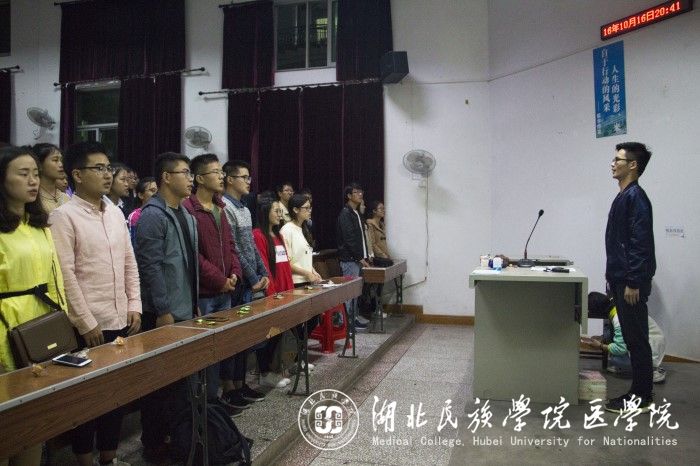 本网讯(记者 张红珠 徐祎 刘心星)10月16日晚,由共青团湖北民族学院医学院委员会主办的喜迎祖国67华诞主题团日活动在我院8204教室顺利举行。本次大会由学生干部姚明泽担任主持,我院15、16级与各二级学院共两百多名学生参加了此次活动。