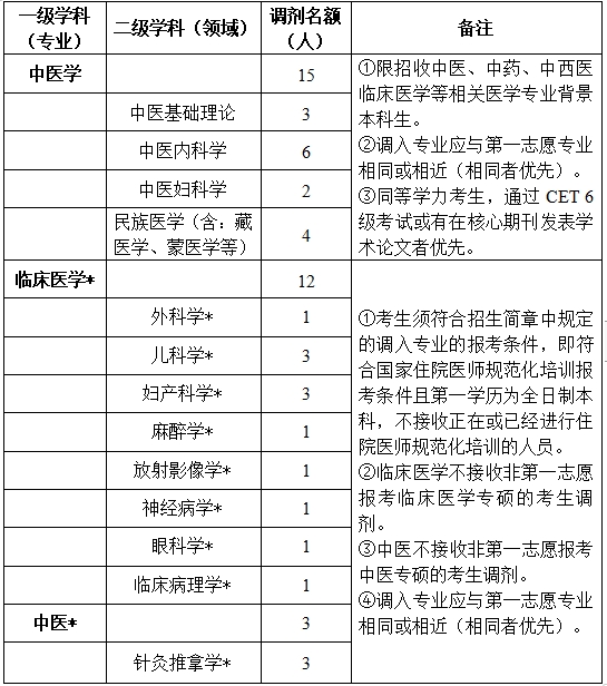 按照学校招生计划,现将医学部硕士研究生各学科/专业招生调剂名额及相关事项公布如下: