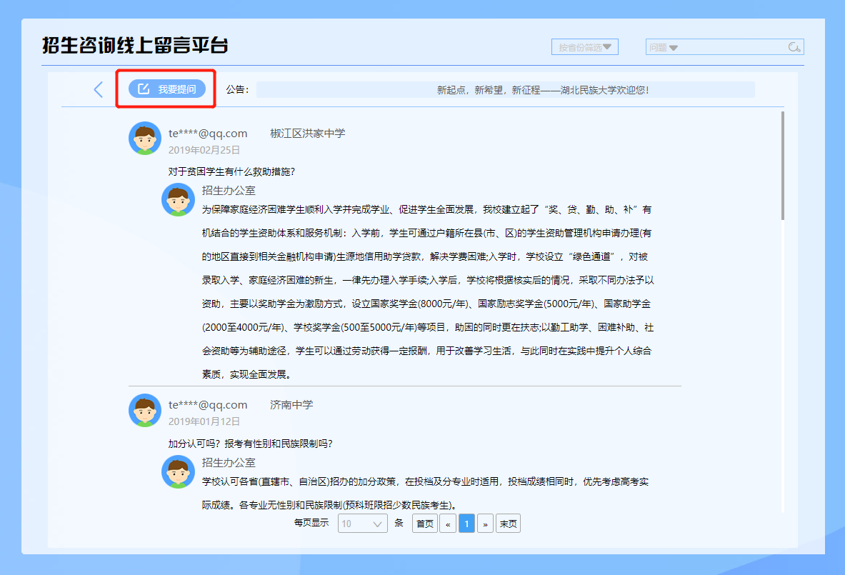 ❖“留言板”模块方便考生及家长留言超出系统常见题目范围的问题,可查询部分考生提出的问题或者点击“我要提问”(图6),准确填写相关信息后(图7)由招生办工作人员解答后直接发送至所留邮箱,考生及家长可及时关注邮箱并查收回复。